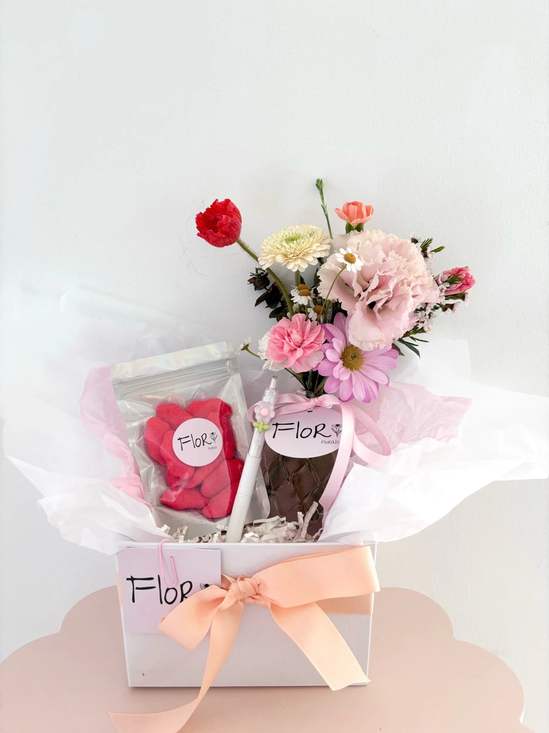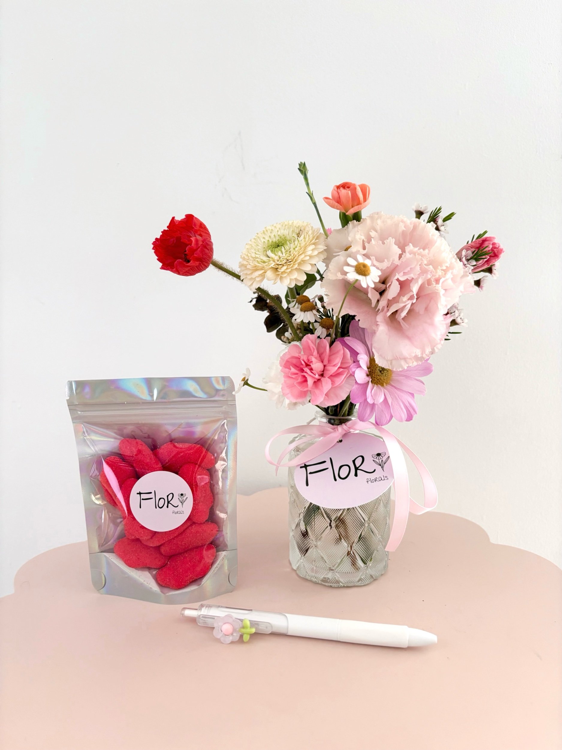 Say thank you in the sweetest way with our Mini bloom Box! A thoughtful little bundle that’s perfect for teacher gifting. Each box includes one of my signature mini posy jars filled with beautiful fresh blooms, a flower pen for their desk, and a packet of soft strawberry cloud lollies for a touch of sweetness. A charming mix of beauty, fun, and gratitude, sure to brighten their day!
